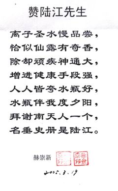 凡尊重中國古代養(yǎng)生智慧的患者,堅持“已饑方食”和定時主動補水者,均可祛病康復(fù)。如牡丹江醫(yī)學(xué)院87歲的張鵬圖飲用半年后高血壓未痊愈,陸江與他通話交流,了解他原先每日主食4兩,建議他用“已饑方食”減少主食肉食量,他理解后,將每日主食減為3兩,少吃兩塊肉,飲用一年治愈26年的冠心病和高血壓。他2003年5月31日來信說:“飲用卓康小分子團(tuán)水是根治高血壓、冠心病、糖尿病的一把金鑰匙,是填補醫(yī)學(xué)空白,為人類造福,應(yīng)推廣該產(chǎn)品。”