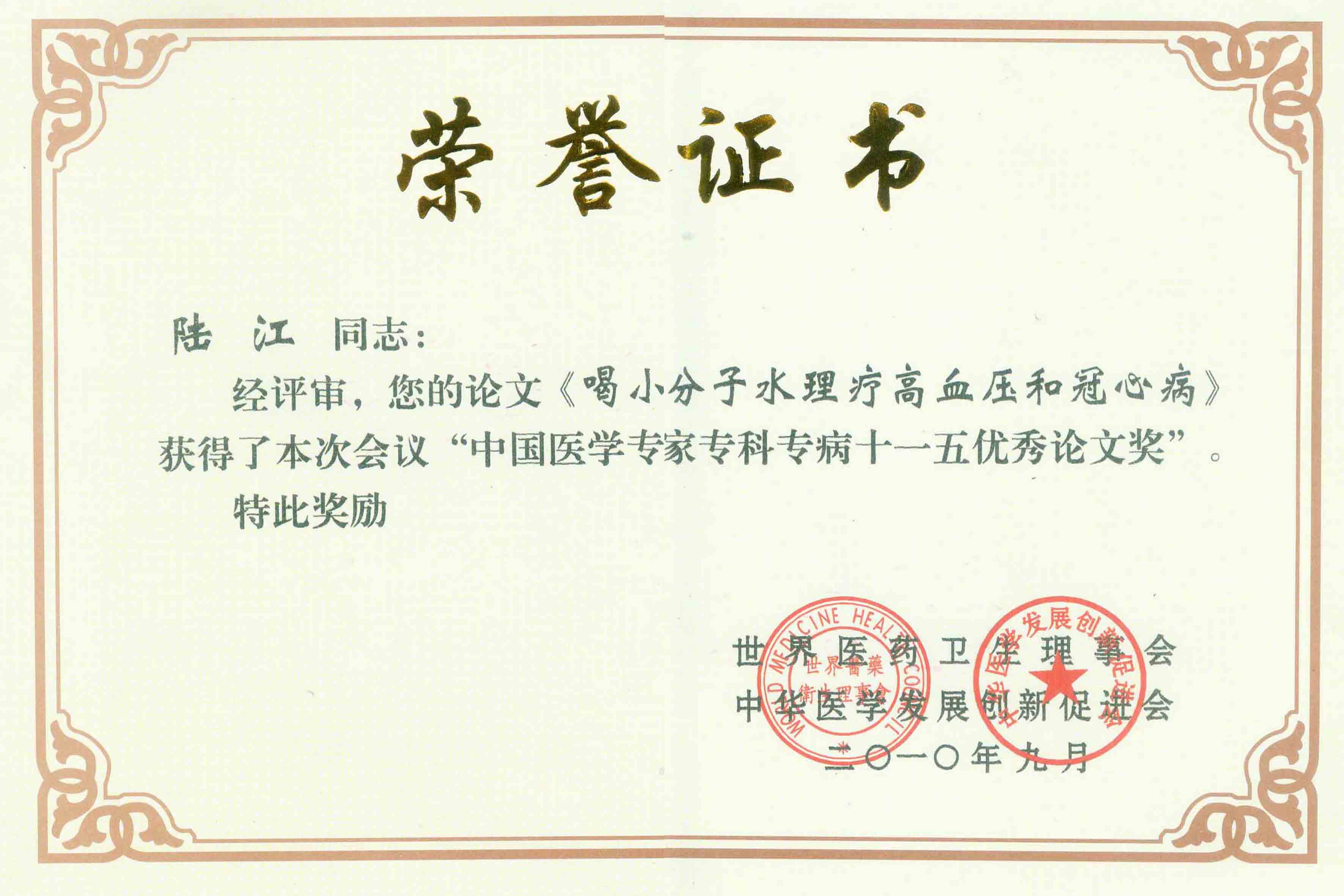 新疆63歲的賀兆生飲用一年,冠心病未愈,他用電話介紹是食堂管理員,問他食量多少?說吃七八分飽,睡前還吃兩袋牛奶,陸 江說我在論文和書中多次批判“吃七八分飽”,關(guān)照患者務(wù)必用“己饑方食”控制主食肉食量,要他把牛奶改在早中餐吃,減少主食肉食量,建議不吃晩餐,晚上只吃一個蘋果,再經(jīng)幾個月補水節(jié)食,治愈了21年的冠心病和肥胖、失眠等病,信中由衷地感激陸 江為再生父母。[13]因為醫(yī)生從未過問他的膳食習(xí)慣,只管開處方藥或手術(shù),父母也不會叫他不吃晩飯。