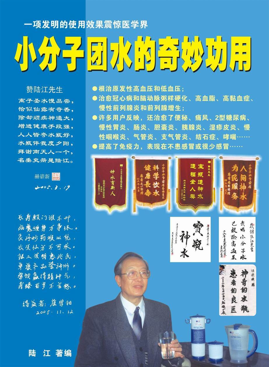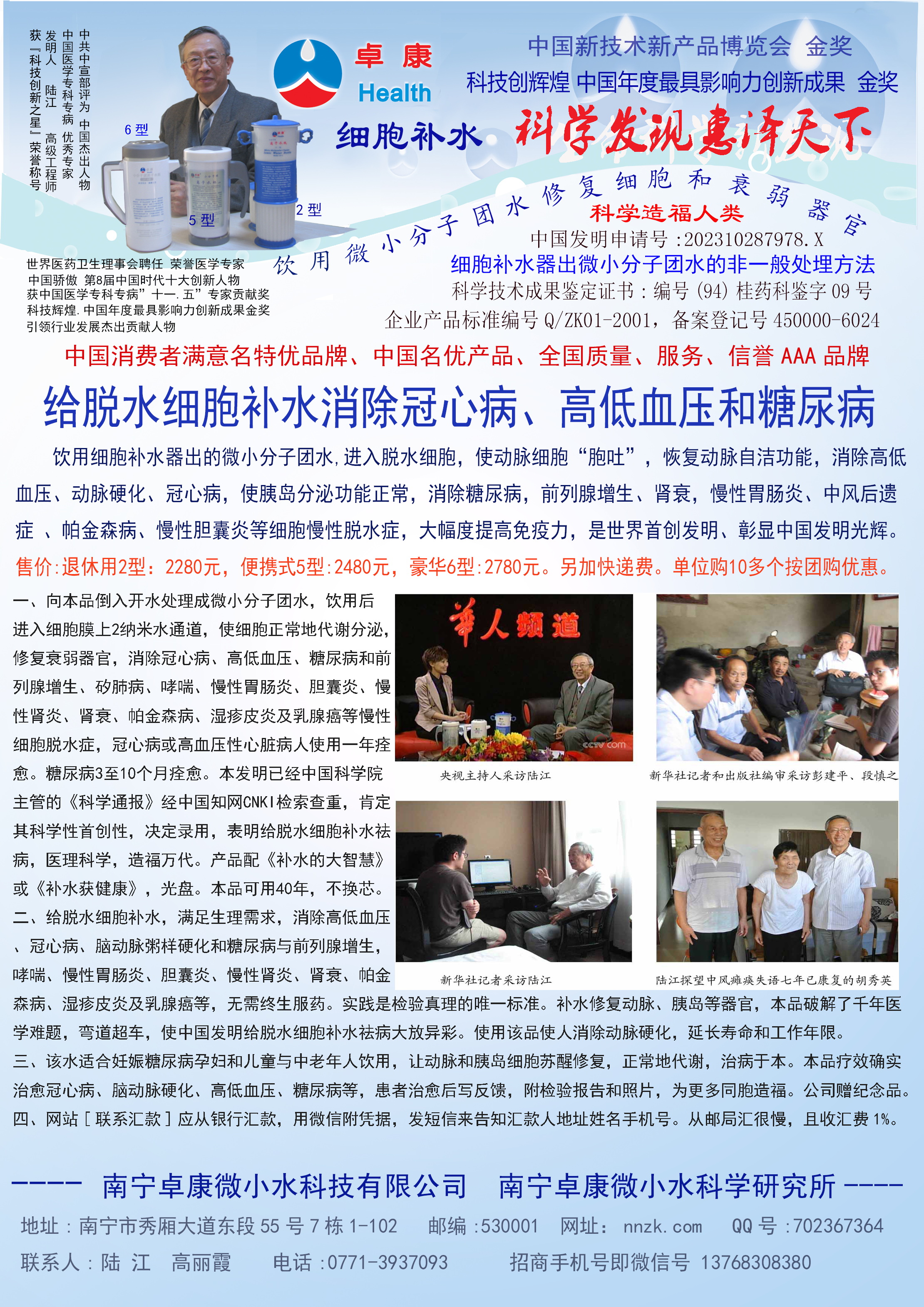 人類幾千年來患以上病癥需終生服藥,幾十年也不能治愈。可是我國南寧的高級工程師陸 江,于1990年想根治高血壓,研究發(fā)明了離子水瓶,處理出微小分子團(tuán)水供飲用,經(jīng)過醫(yī)院臨床試用和專家鑒定,1999年獲中國發(fā)明專利權(quán),產(chǎn)品于2000年投放市場后一直跟蹤調(diào)查,據(jù)全國各地用戶反饋:祛除了高低血壓、糖尿病和冠心病,并使前列腺增生、咽喉炎、鼻竇炎、慢性氣管炎、支氣管炎、矽肺病、哮喘、慢性胃炎、腸炎、慢性膽囊炎、慢性腎炎、腎衰、膀胱炎、便秘、痔瘡、風(fēng)濕性關(guān)節(jié)炎和濕疹皮炎及中風(fēng)后遺癥等病癥不藥而愈。為什么喝微小水能治20多種病?陸 江從1991年德國科學(xué)家發(fā)現(xiàn)細(xì)胞膜水通道僅為2納米獲得啟發(fā),認(rèn)為多種器官患病是因細(xì)胞脫水,不能正常代謝和分裂增殖,才使器官細(xì)胞減少致衰弱萎縮而形成細(xì)胞缺水性病癥。22年來的實踐有力地支持了“細(xì)胞脫水致病”這一重要論點,表明喝微小水可滿足細(xì)胞的生理需求,補水就能祛病,是生命科學(xué)新亮點。